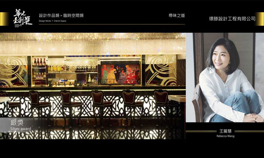 在長達半年的遴選程序中,璟滕設計 王麗慧 設計總監 以奢華而細膩的設計筆法,將金屬工藝與豐富色彩編入空間,透過個人獨有的審美高度,重新展示時代經典;在繁複而不顯雕琢痕跡的刻畫技法之下,順利的以作品《尋味之道》 摘下臨時空間類別「銀獎」殊榮;除為華人設計圈再添榮耀外,更替自身品牌地位豎立不可動搖的經典地位!