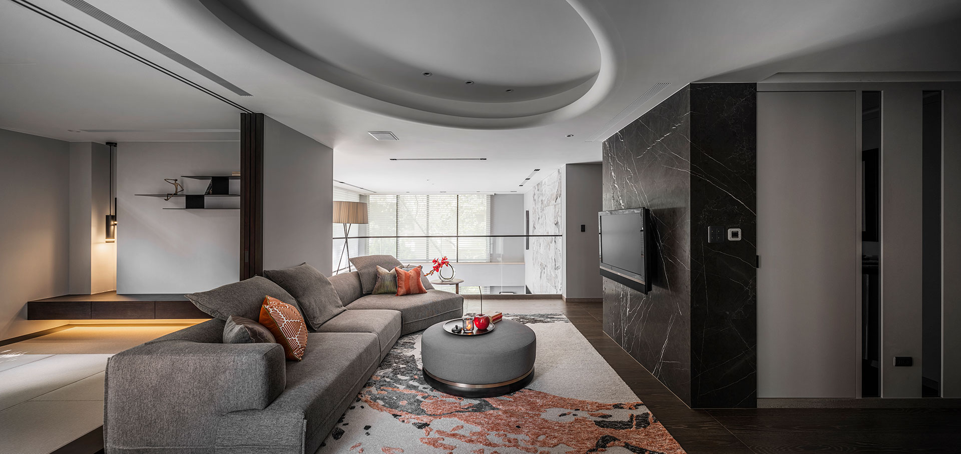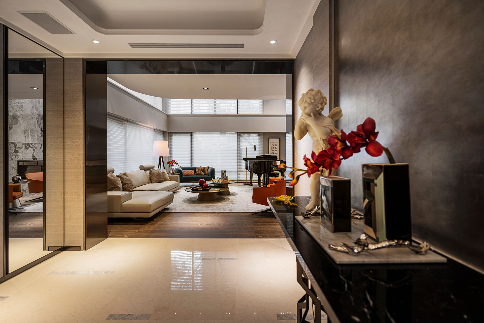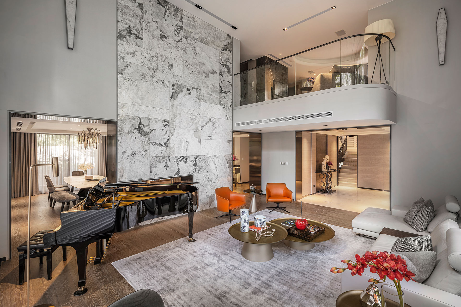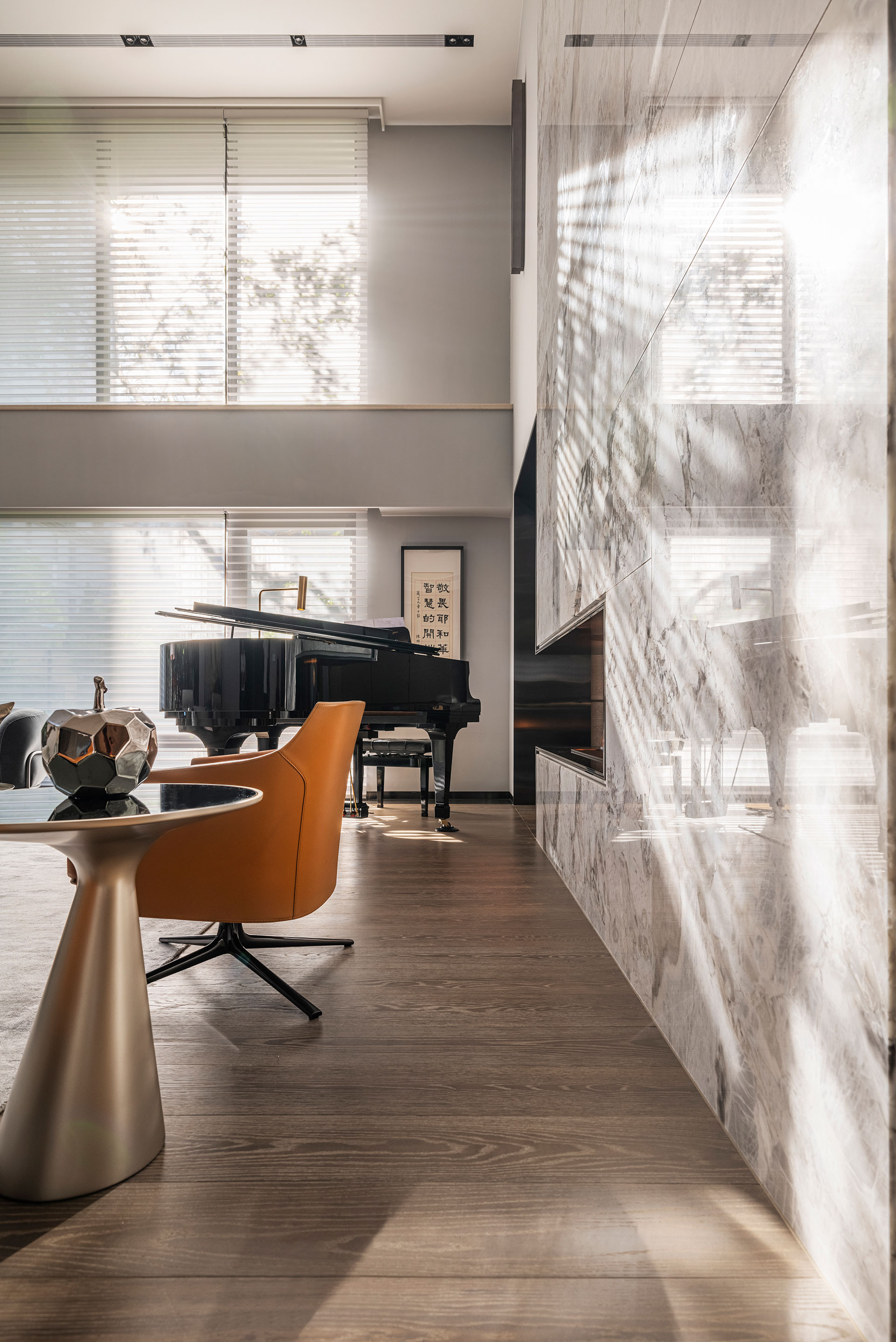 此案為改建20年來的居家風格,將新古典風格優雅轉身為現代簡約。四個樓層的一樓為公共空間,客廳採光的幅度加大,打開更廣闊的視野風光,以容納更多的美感進駐,客廳一方面做為宴客接待廳堂之用,鋼琴與大尺度餐廚廳的設計,使得舉辦餐會與小型音樂會的活動時行走動線流暢。