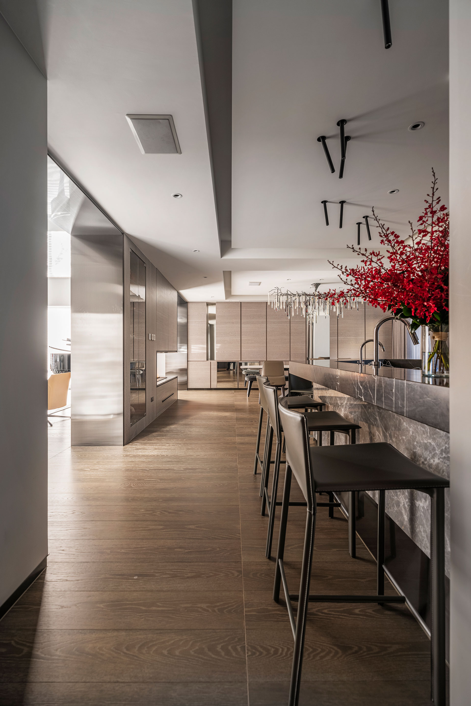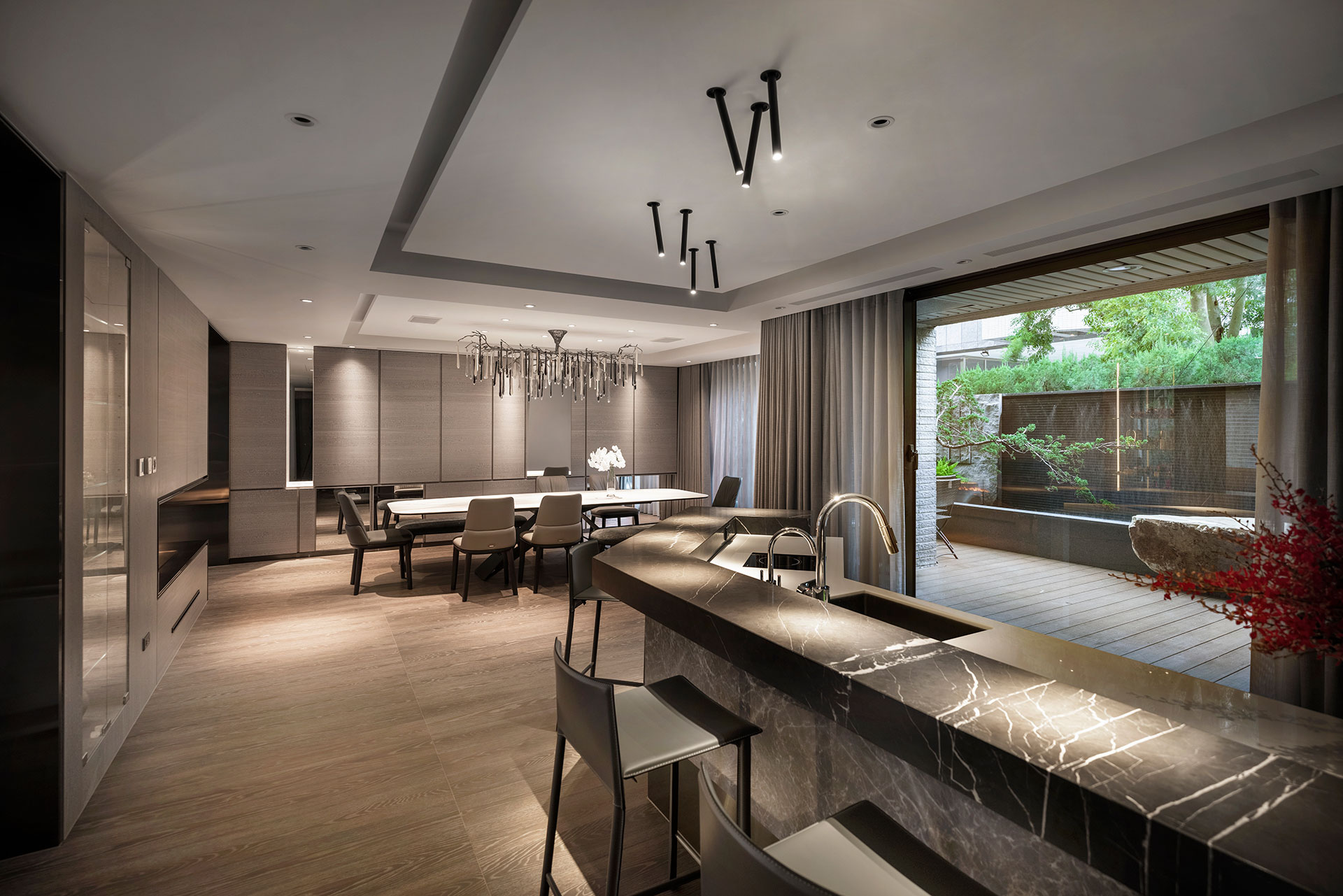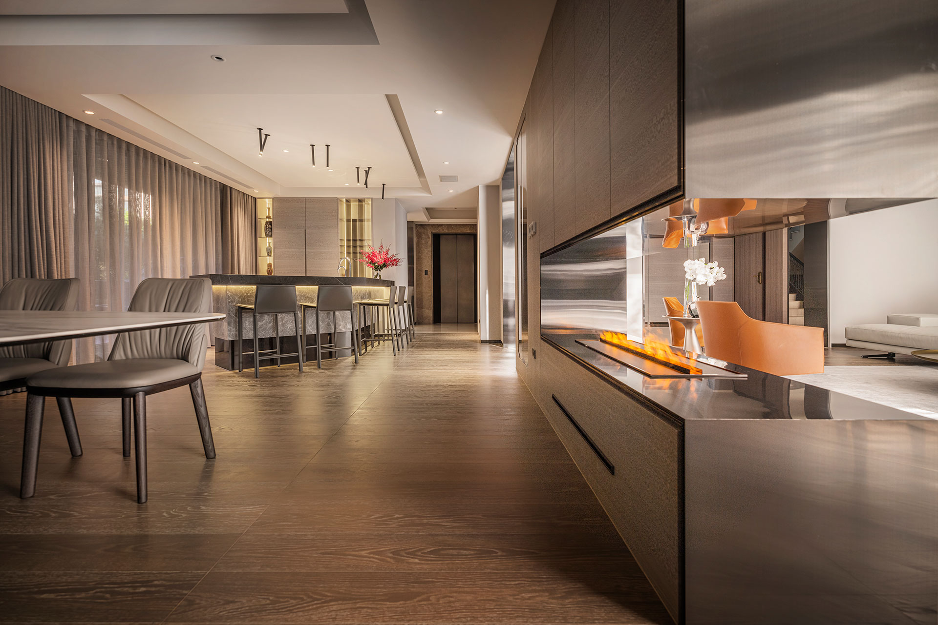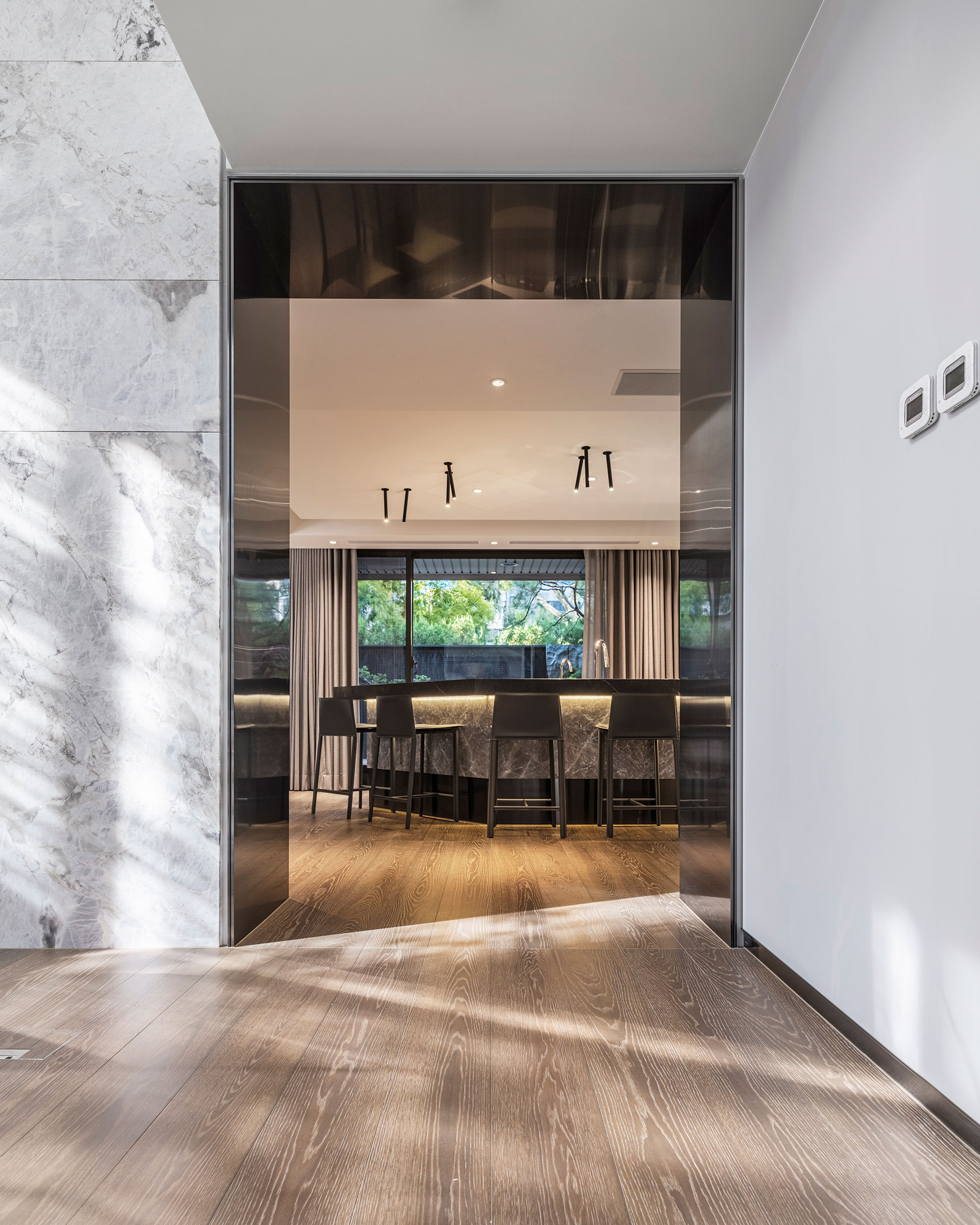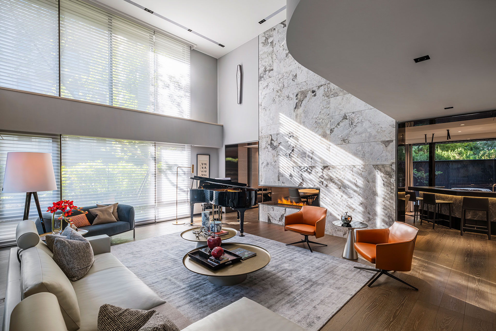 此案為改建20年來的居家風格,將新古典風格優雅轉身為現代簡約。四個樓層的一樓為公共空間,客廳採光的幅度加大,打開更廣闊的視野風光,以容納更多的美感進駐,客廳一方面做為宴客接待廳堂之用,鋼琴與大尺度餐廚廳的設計,使得舉辦餐會與小型音樂會的活動時行走動線流暢。
