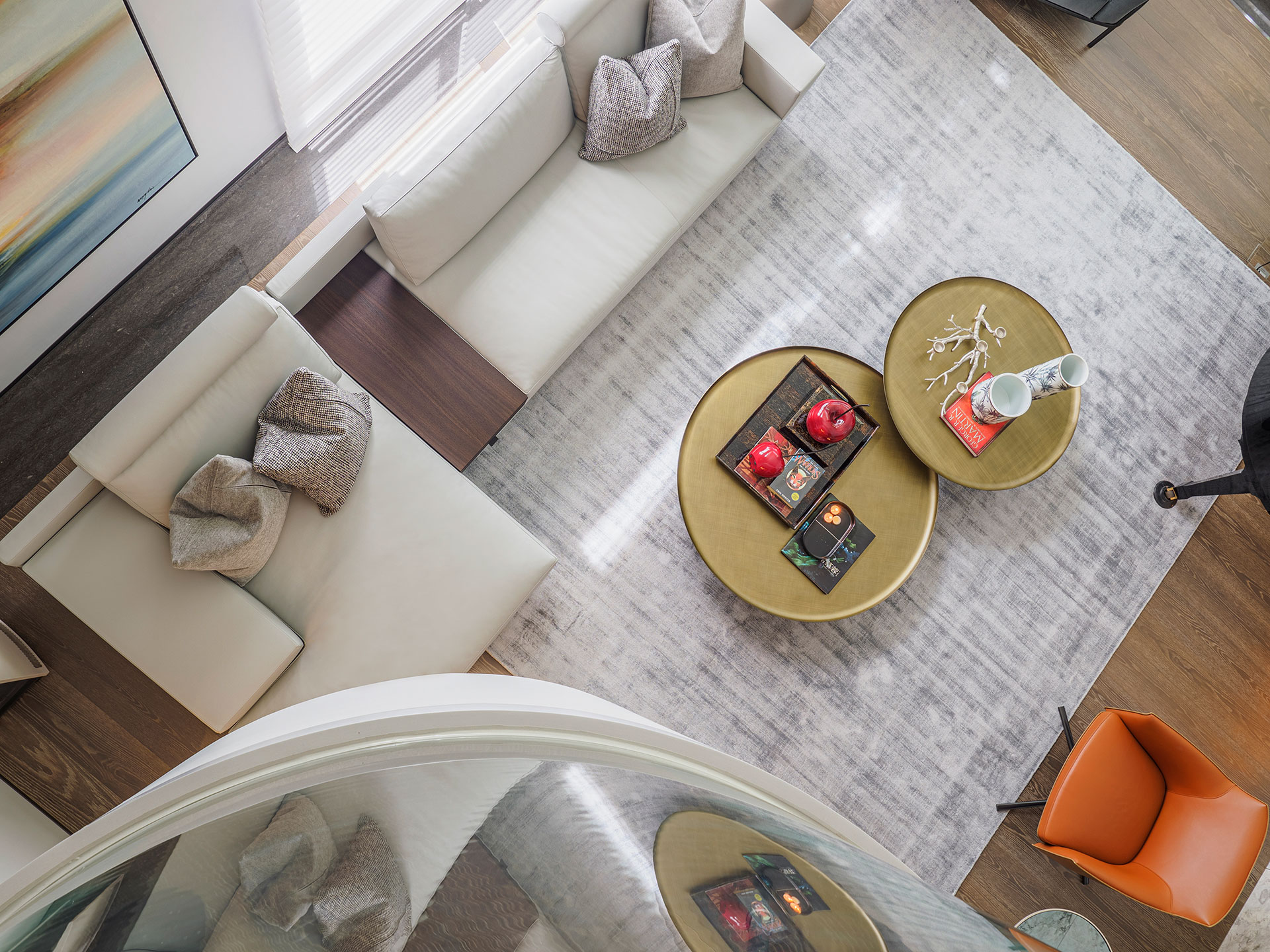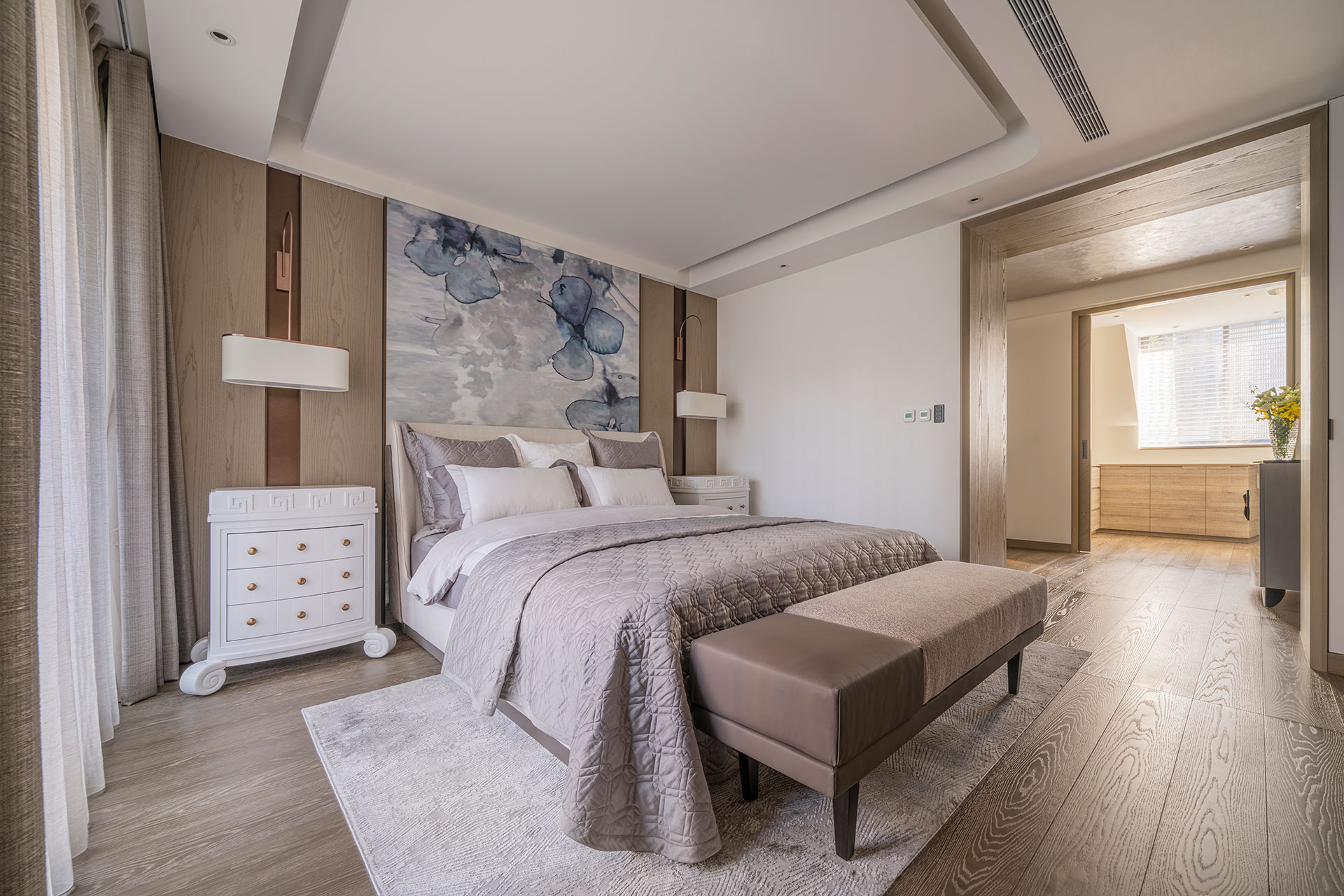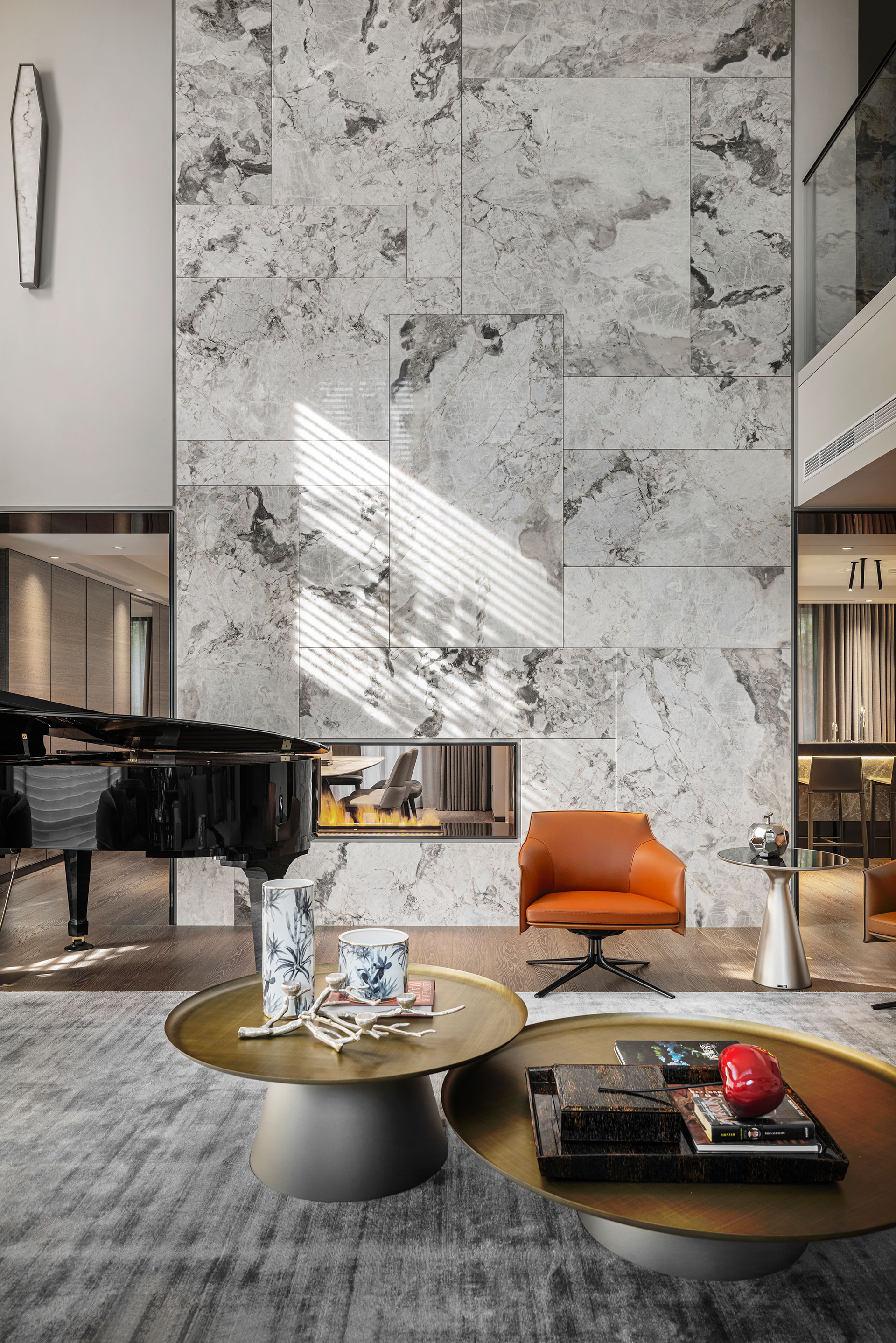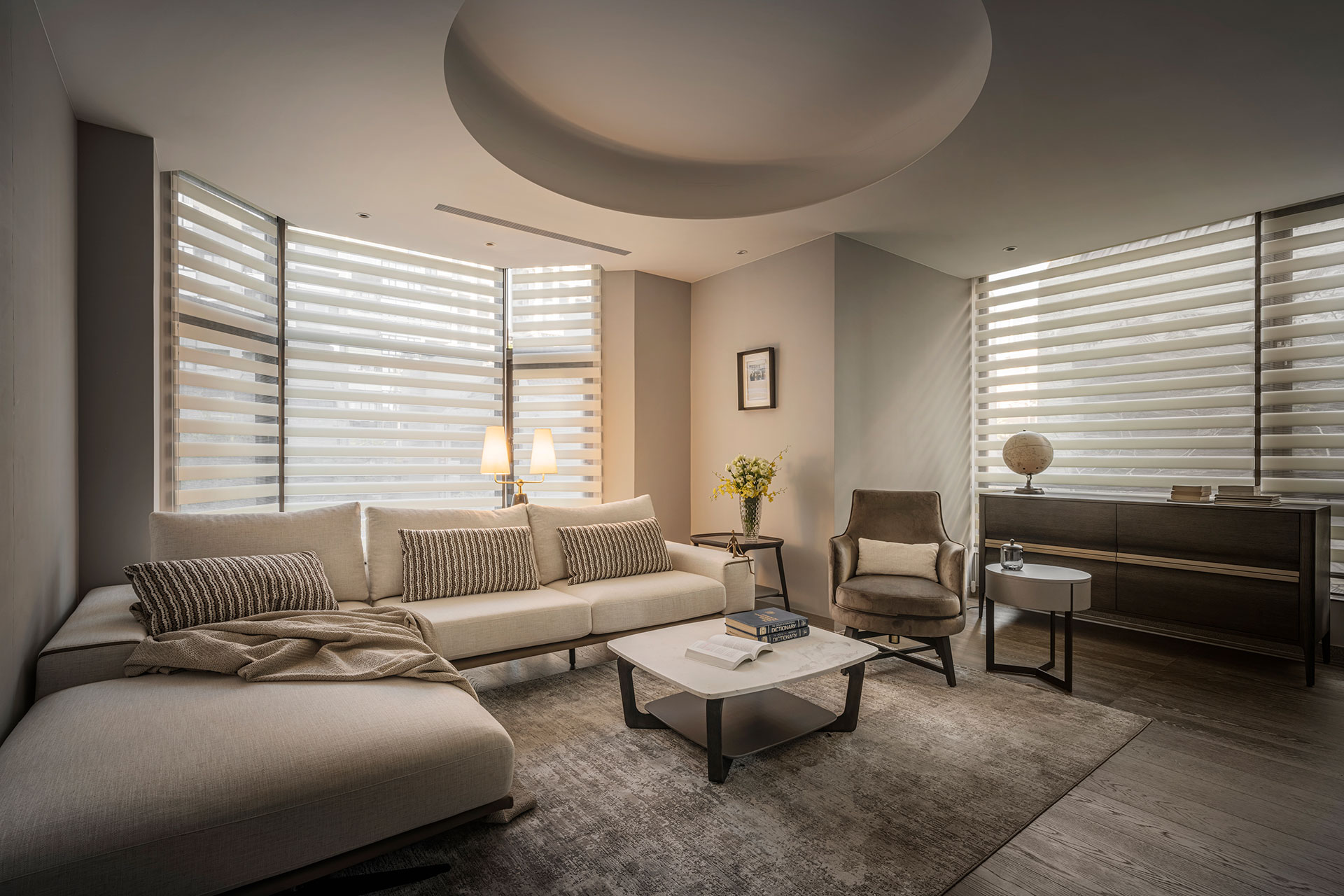 此案為改建20年來的居家風格,將新古典風格優雅轉身為現代簡約。四個樓層的一樓為公共空間,客廳採光的幅度加大,打開更廣闊的視野風光,以容納更多的美感進駐,客廳一方面做為宴客接待廳堂之用,鋼琴與大尺度餐廚廳的設計,使得舉辦餐會與小型音樂會的活動時行走動線流暢。
