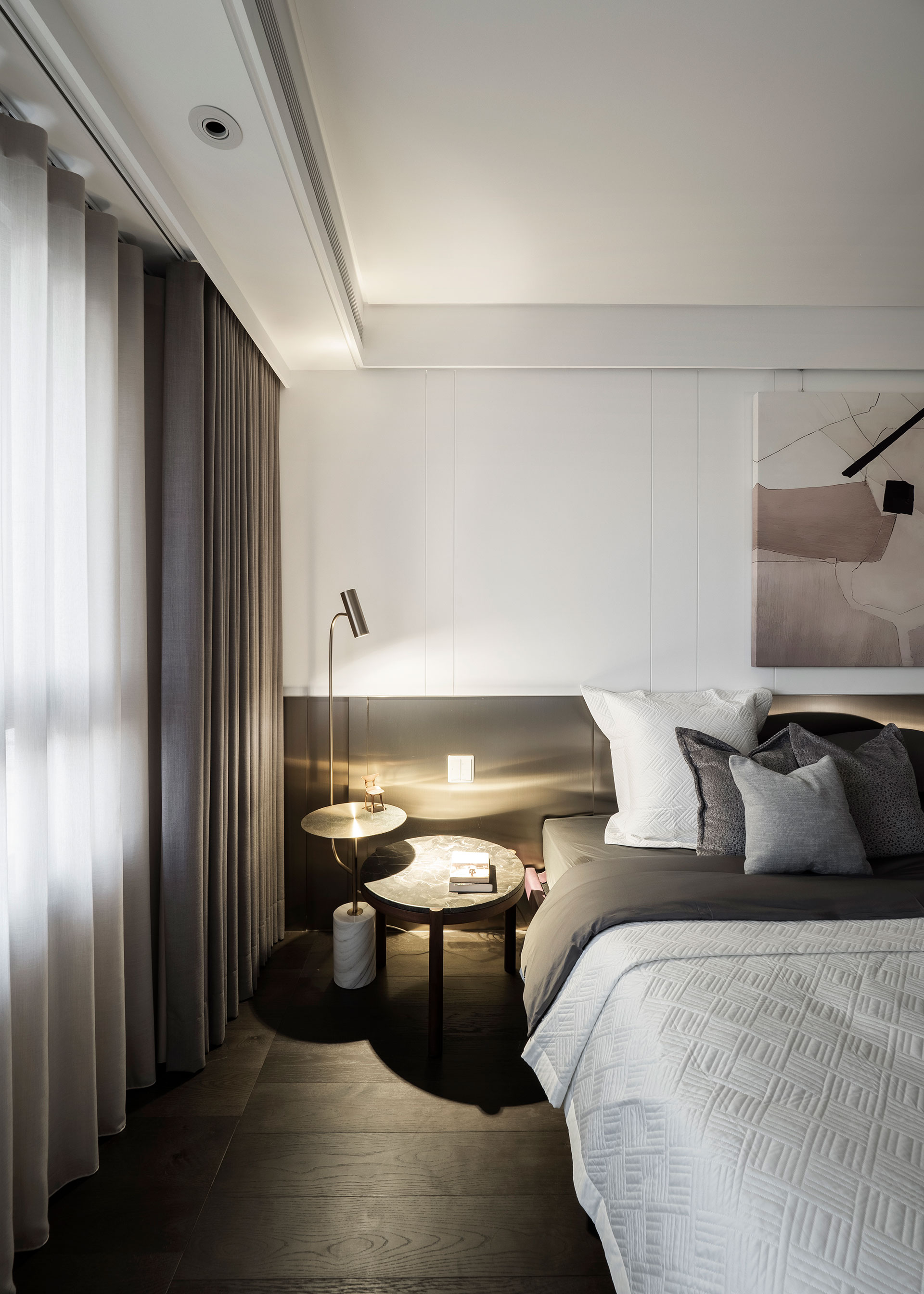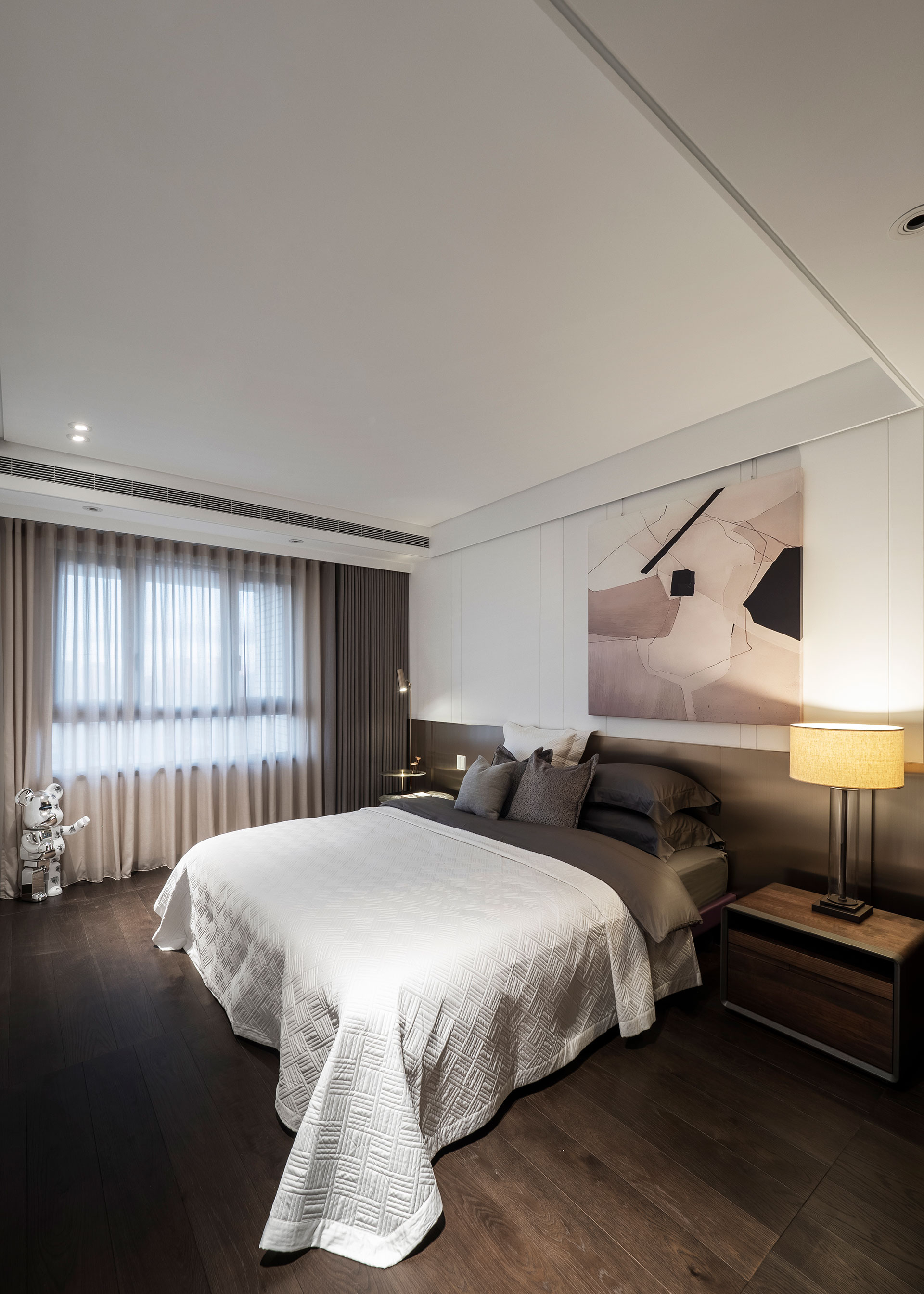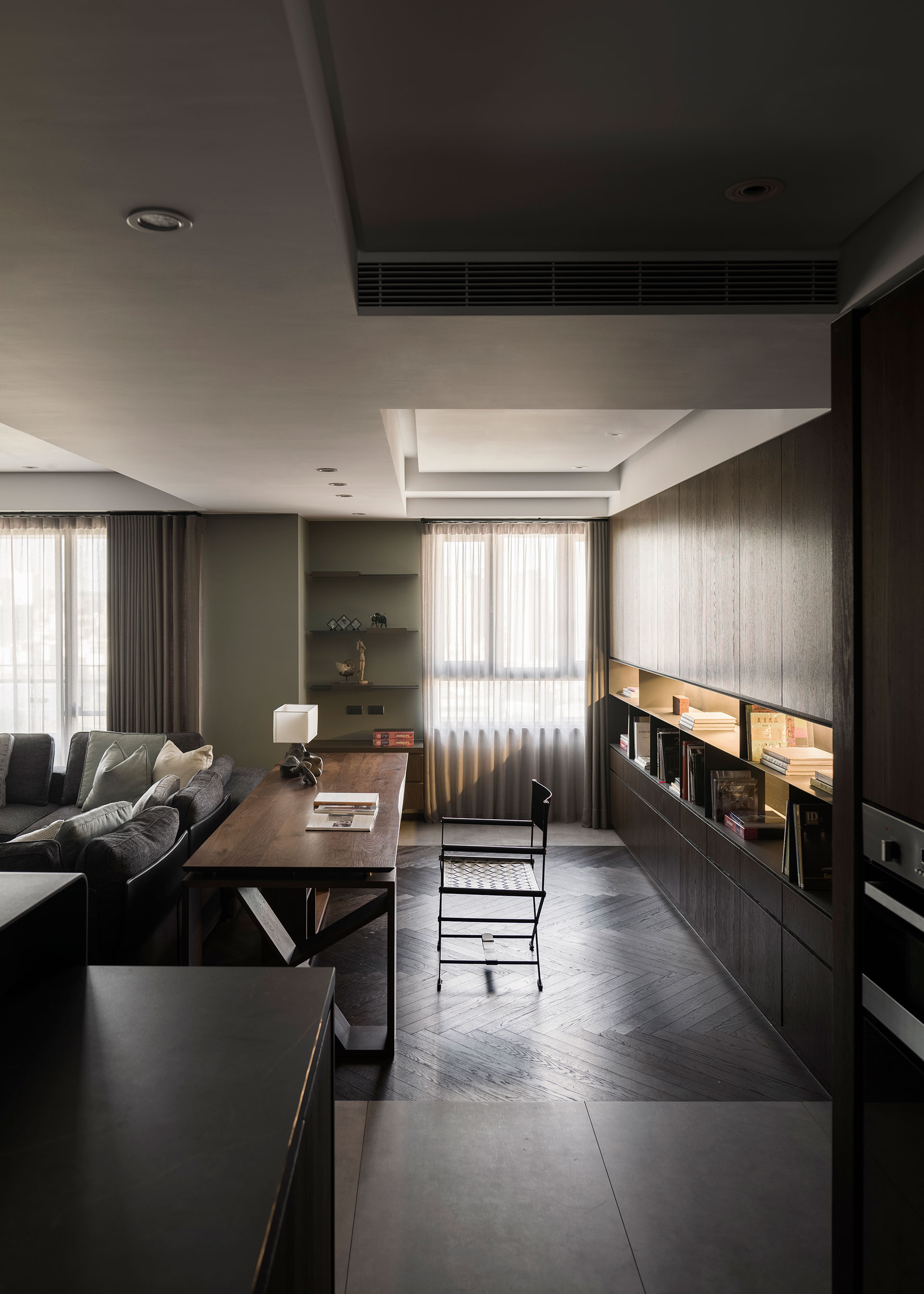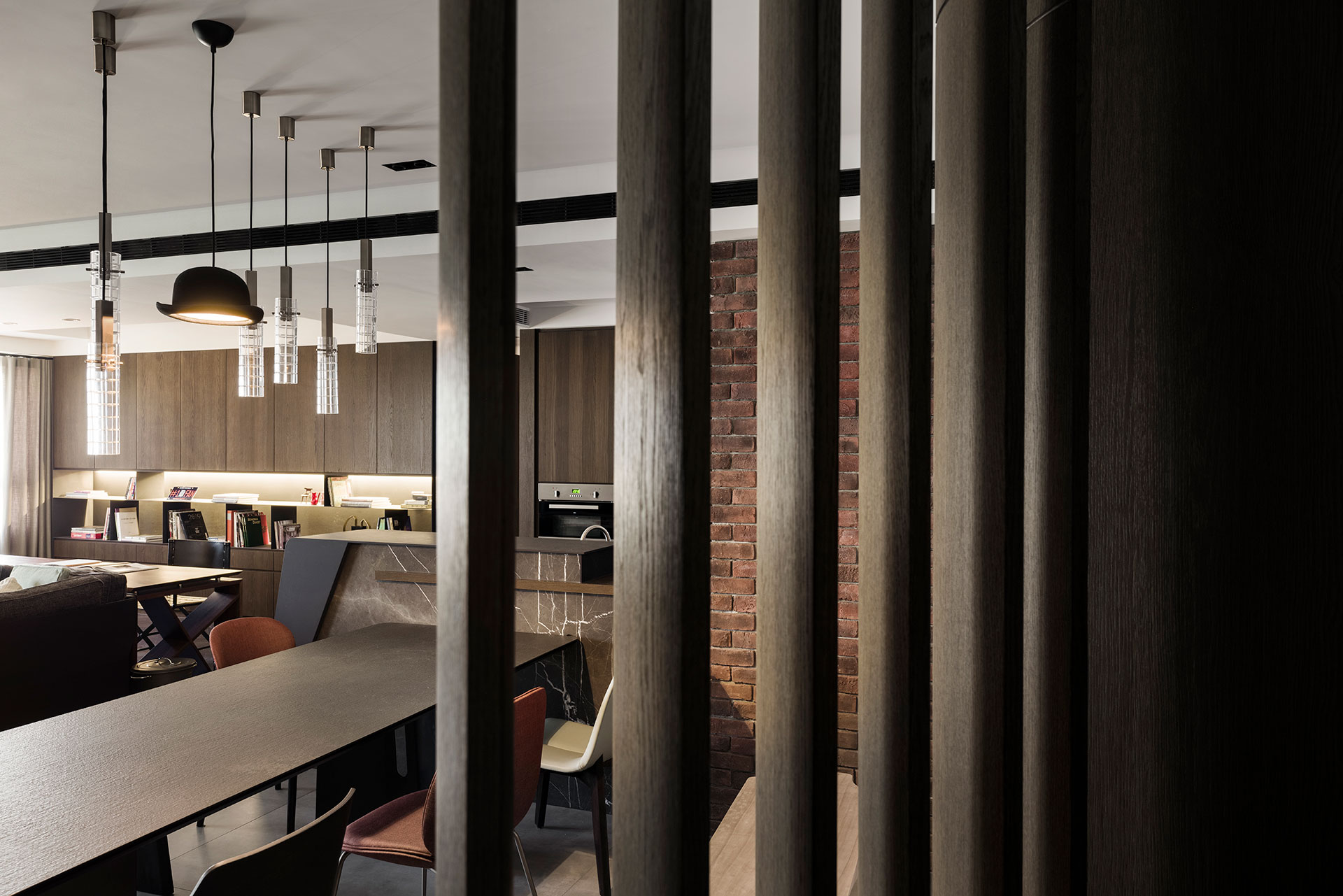 屋主是年輕的設計人,喜歡古典與現代並和的元素。以連續鏤空的直向折板屏風與不規則切割地板,微間隔出一個玄關空間,與玄關座椅與畫作的藝術風格,顯現了居家也能是藝術品典藏的場所。在客廳裡造了一座六米長的磚牆,將客餐廳空間串連整合一起,延續性的手法,讓空間有大視覺主體以擴展橫向視野。客廳沙發與書房,整合在一個塊面上,餐廳與廚房、吧台在對稱方位,家中公共空間的聚合與獨立區域,同時發生,而在材質上,以咖啡色系質感建材穩穩為底,深與淺,色系的漸層成了各功能的分野,再加上鐵件適時穿插使用,將懷舊的元素與工業都會的氣息相融合,在看似的衝突對比中,展現出意想不到的趣味接合感。